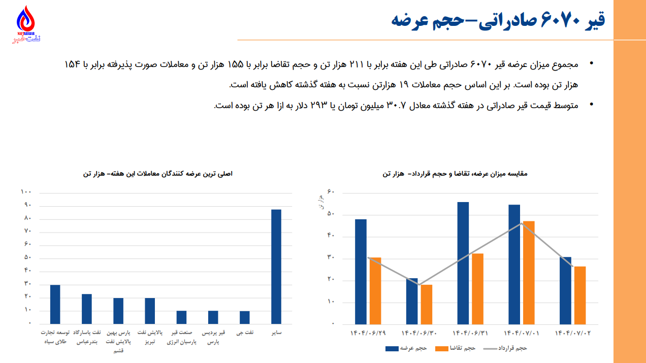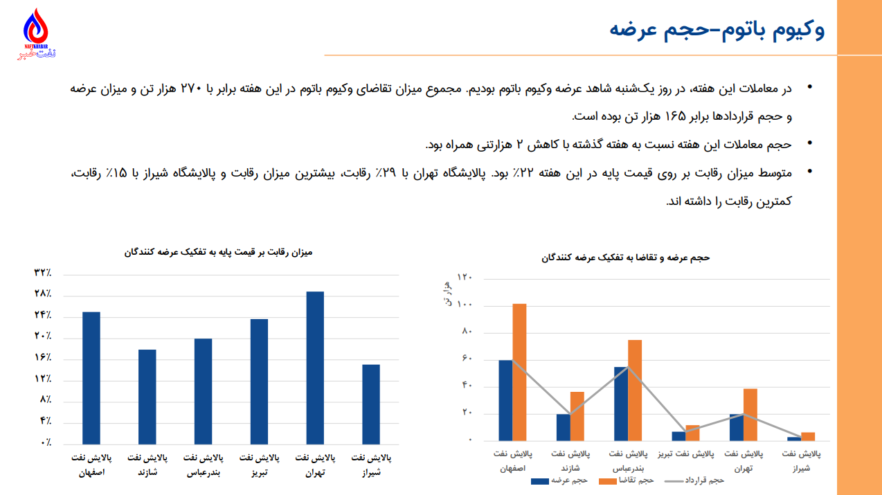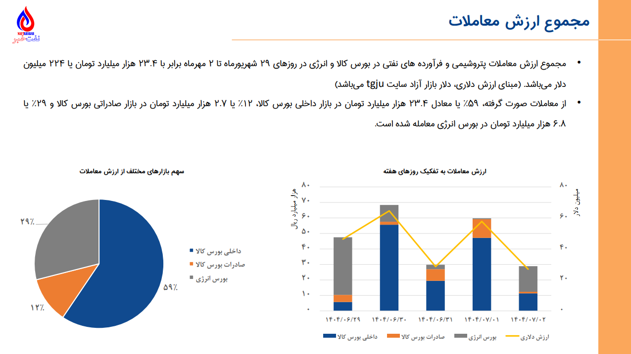 از معاملات صورت گرفته، %59 یا معادل 23.4 هزار میلیارد تومان در بازار داخلی بورس کالا، %12 یا 2.7 هزار میلیارد تومان در بازار صادراتی بورس کالا و %29 یا 6.8 هزار میلیارد تومان در بورس انرژی معامله شده است.